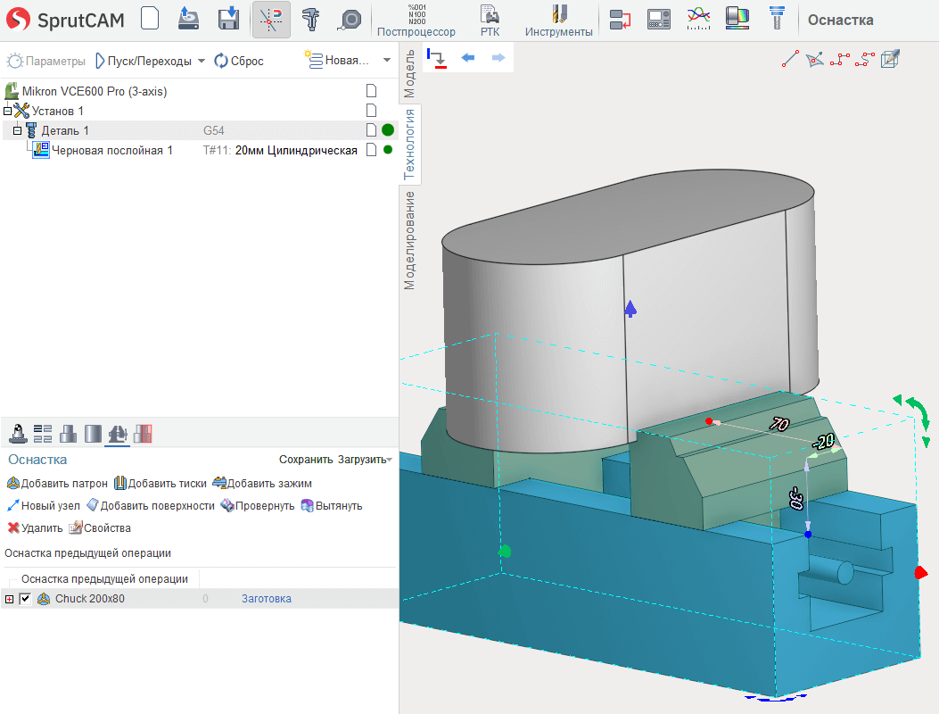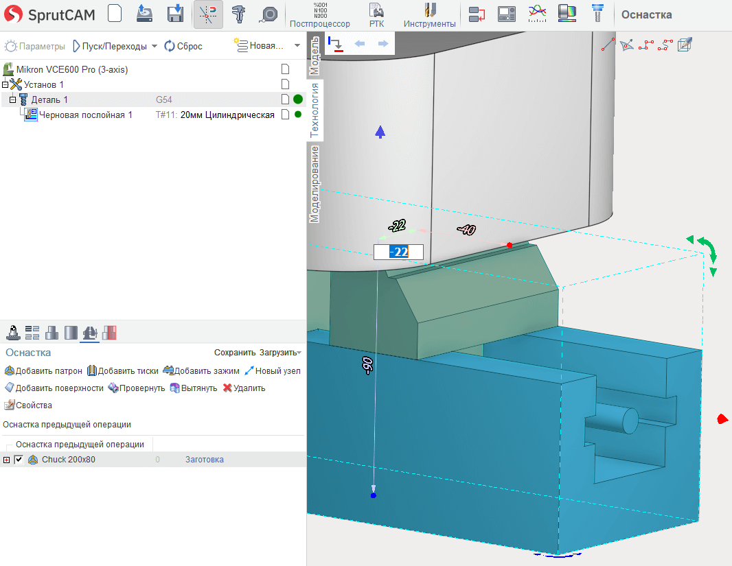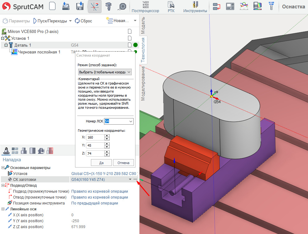 Мышкой перетаскиваю систему координат заготовки G54 в центр детали. Умные привязки помогают это сделать.