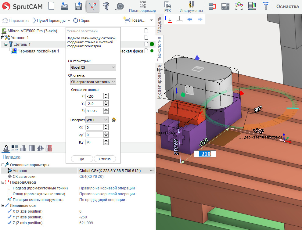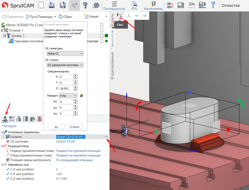 После этого, я перехожу на вкладку Наладка и открываю окно с настройками Установа. При этом активируется режим Привязки (Glue). Так я смогу быстро расположить заготовку с тисами на столе станка.