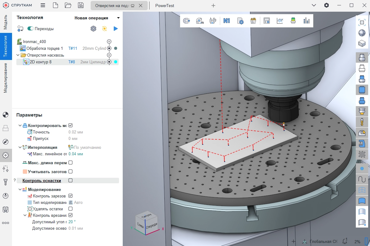 Добавили возможность отключить контроль столкновений с оснасткой для операций 2D Контур и Обработка сверления. Например, для случаев, когда допускается просверлить деталь и подложку.