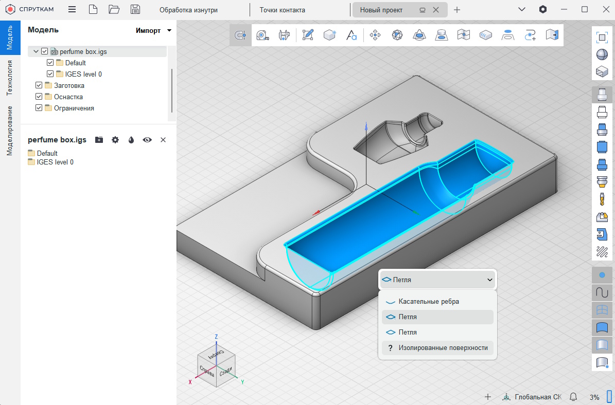 Если сначала выделить замкнутый контур, а затем снова кликнуть по грани контура правой кнопкой мышки, то в меню выбора элементов появится пункт «Изолированные поверхности». Теперь так можно выбрать все поверхности внутри выделенного замкнутого контура, например поверхности профильного кармана.
