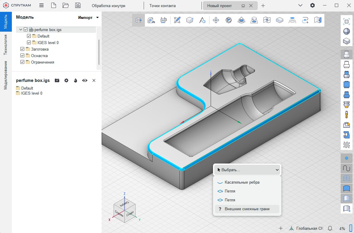 Если сначала выделить замкнутый контур, а затем снова кликнуть по грани контура правой кнопкой мышки, то в меню выбора элементов появится пункт «Внешние смежные грани». Теперь так можно выбрать все поверхности, смежные граням выделенного замкнутого контура, например, так можно выделить поверхности скругления граней.