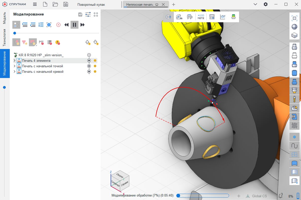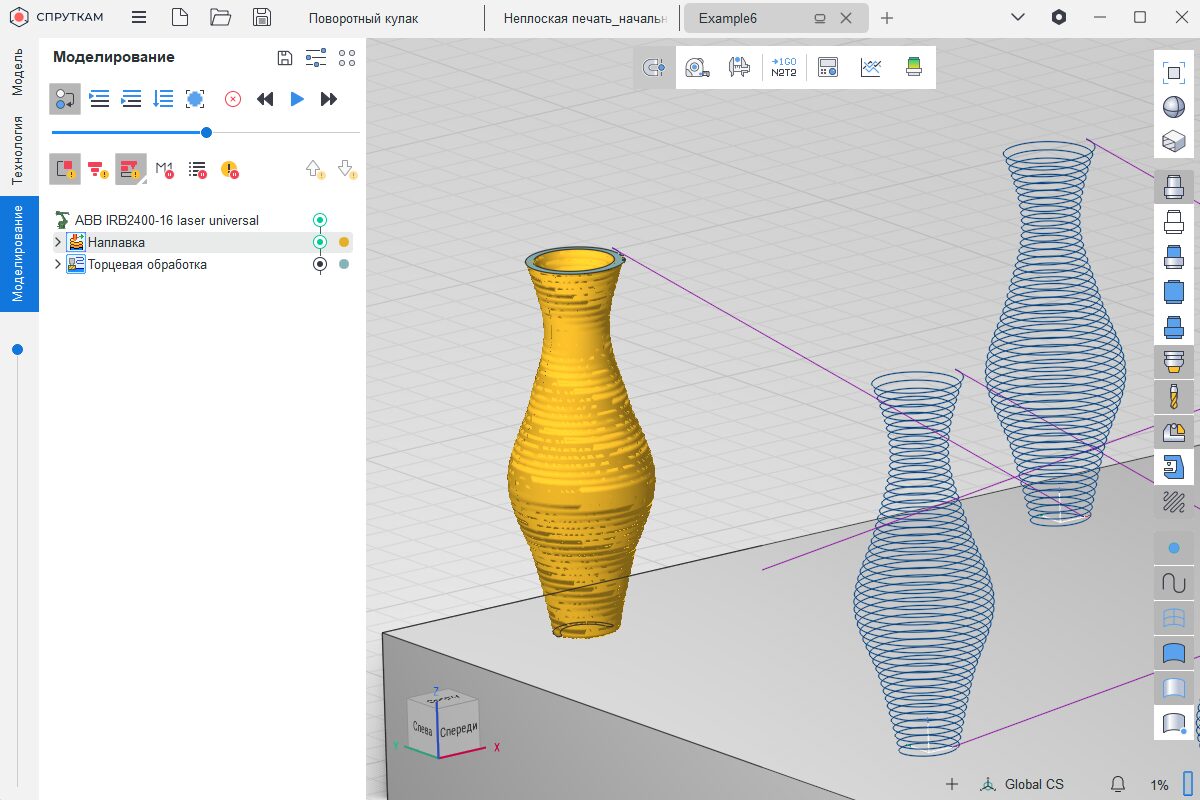 В новой версии операция «Неплоская печать» получила масштабное обновление, значительно расширяющее её возможности. Теперь поддерживается загрузка моделей в форматах IGES, STEP и других, что позволяет использовать 3D-поверхности для расчета траекторий. Добавили новую стратегию плоской печати. Добавили гибкую настройку начальной точки, которая обеспечивает равномерное распределение мест начала и окончания подачи материала и, как следствие, повышает качество поверхности.