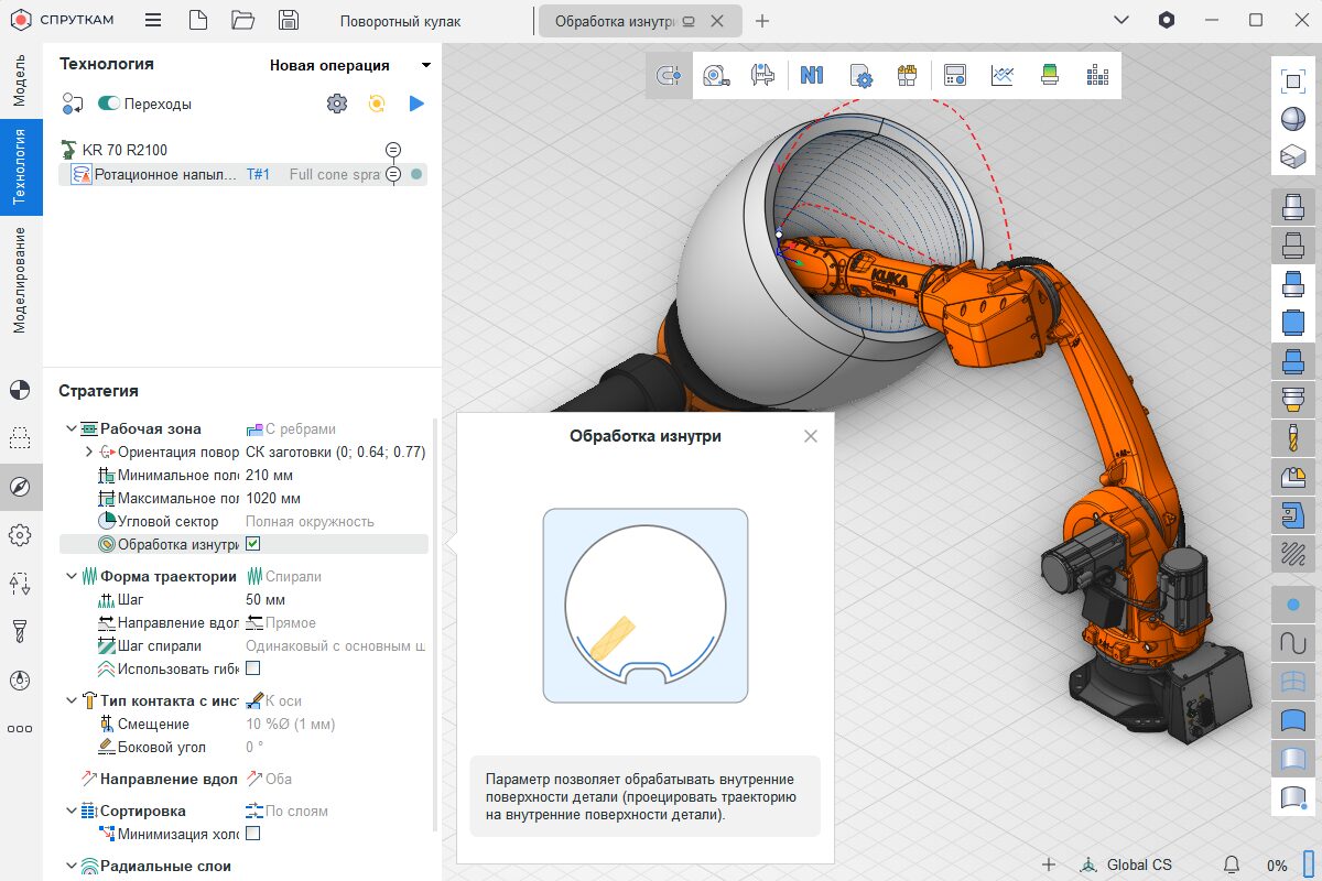 Новая опция позволяет автоматически построить траекторию обработки внутренних поверхностей. Доступно для операций 5D по поверхности, ротационная послойная и операций нанесения покрытий.