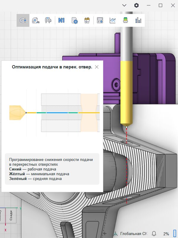 Умная регулировка подачи в углах автоматически снижает скорость движения инструмента в зависимости от заданной пользователем геометрии. Плавное замедление продлевает срок службы инструмента и повышает качество обработанной поверхности.