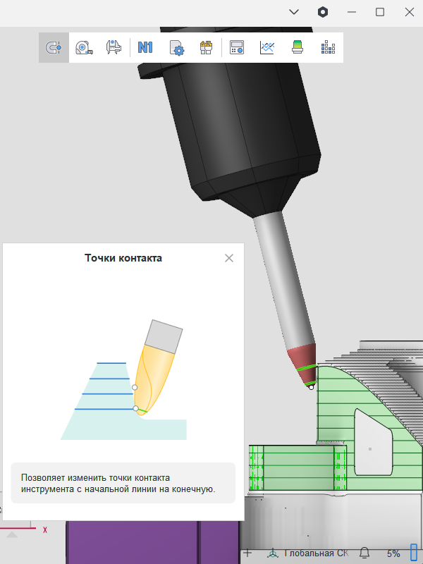 Новая опция для бочкообразных фрез точки контакта позволяет контролировать область контакта между инструментом и обрабатываемой поверхностью, автоматически меняя наклон инструмента от начального параметра до конечного. Доступно для операций 5D по поверхности и 5D стенки.